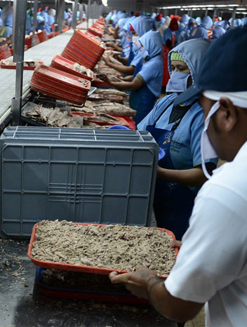 Contamos con tecnología de punta para la producción y selección de los carídeos. El proceso en la planta arranca al recibir el camarón fresco de excelente calidad proveniente de fincas propias o proveedores calificados, luego de un análisis riguroso y sistemático de calidad.Dependiendo de las necesidades específicas y pedidos de nuestros clientes, el camarón se procesa entero, sin cabeza o pelado, manteniendo siempre su frescura y textura.